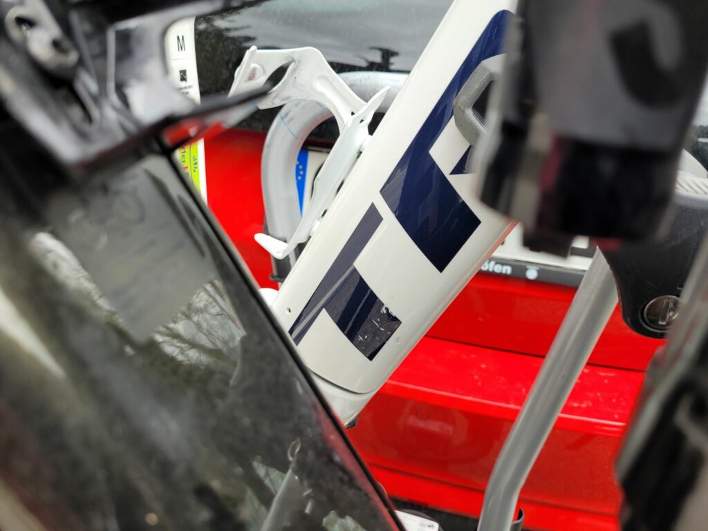 Als wir die Einfahrt hochrollen, macht es ein unangenehmes Geräusch und der Fahrradträger hat sich weggeklappt (wie man es (vorsichtig) zum Kofferraum öffnen machen kann). Sch… Weit sind wir ja noch nicht gekommen. Er war wohl nicht richtig eingerastet.